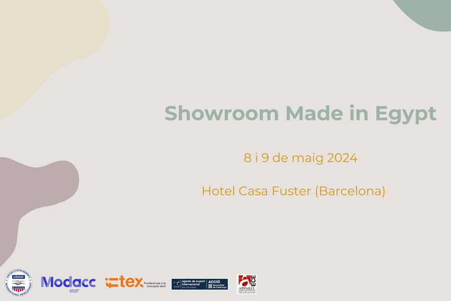 Los días 8 y 9 de mayo, este showroom dará a conocer, en el Hotel Casa Fuster de Barcelona, la capacidad de una treintena larga de productores egipcios del sector textil y de la confección, que expondrán sus piezas de denim, de punto y plano, ropa de baño, ropa deportiva, ropa interior, etc., a empresas catalanas del sector de la moda, con el fin de fomentar la creación de alianzas estratégicas entre las empresas de ambos países.