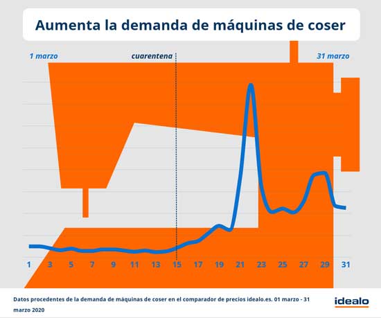 Un efecto curioso de la cuarentena es el incremento de búsquedas de máquinas de coser. «A lo largo de los días se ha contemplado cómo muchos ciudadanos han querido aportar su granito de arena a la causa cogiendo aguja e hijo y fabricando mascarillas caseras. Para ofrecer información al respecto, el Ministerio de Industria, Comercio y Turismo ha elaborado una guía oficial que detalla los materiales más adecuados y la forma de confeccionarlas. En este contexto, se observa que durante todo el mes de marzo la demanda de las máquinas de coser ha crecido en un 366%. El 22 de marzo se alcanzó el pico más alto de demanda y, sin embargo, su precio ha caído un 40%, con una diferencia de hasta 166 euros de precio medio si comparamos febrero y marzo de este año».