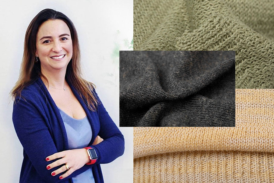 En la foto, Carolina Sister Cohn (Eastman), y ejemplos de punto con Naia y lino (AA Global), Naia y algodón (de la iniciativa Better Cotton), y Naia + poliéster reciclado y lino, estos dos últimos, de Artwell.