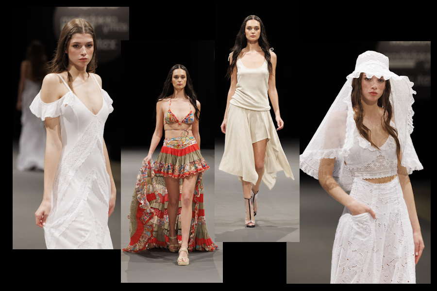 A continuación se pudieron ver las propuestas de Vintage Ibiza. El dúo, formado por Alberto Serra y José Antonio Marí, presentó una colección en la que las fibras naturales como el algodón, el lino, la viscosa y la seda, se presentan en un amplio abanico de colores lila, verde, fucsia y blanco. Destaca por la elegancia y el romanticismo de las prendas con tejidos vaporosos, adornados con encajes y bordados que reflejan la diversidad y el espíritu libre de la isla de Ibiza. Prendas confeccionadas con tejidos naturales que confieren elegancia y comodidad tanto al hombre como a la mujer.