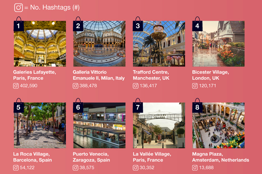 Obsérvese también que Wethrift ha medido para el ránking el número de «hashtags». Lafayette acumula, en el período considerado, más de 400.000. Y le sigue la Galleria Vittorio Emanuele de Milán, con casi 390.000, en segunda posición.