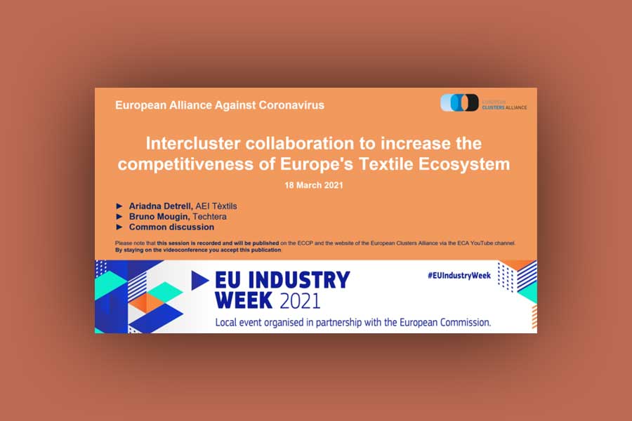 La AEI Tèxtils, clúster de materiales textiles avanzados de Cataluña participó el pasado 18 de marzo en el webinar «Intercluster collaboration to increase the competitiveness of the Europe’s textile ecosystem». Este se enmarcaba en la serie organizada desde el inicio de la pandemia por la European Clusters Alliance, un grupo de intercambio formado por clústeres, asociaciones, instituciones, universidades, empresas, grupos de interés en economía social y otras entidades, que cuenta con estrechas conexiones de colaboración con la Comisión Europea.