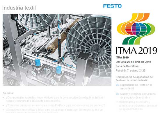 El crecimiento de la demanda textil mundial obliga a los fabricantes textiles a adaptarse a las necesidades del mercado y a los fabricantes de equipos a desarrollar máquinas y sistemas cada vez más rápidos y productivos. Por eso, Festo, firma especializada en soluciones en automatización, presentará en ITMA 2019 (del 20 al 26 de junio en Barcelona) el programa básico «Estrellas de la técnica de automatización» con más de 2.200 componentes fiables y económicos.