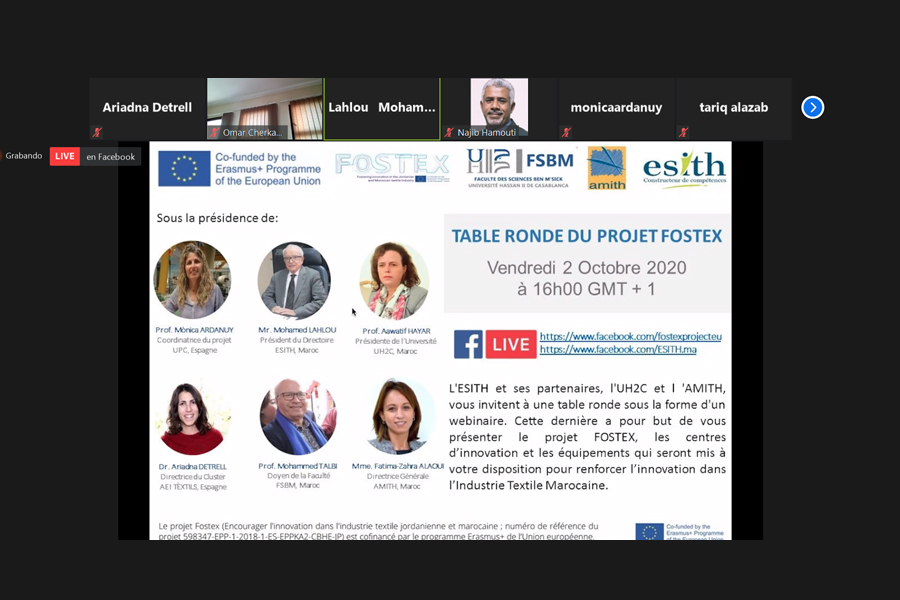 La mesa redonda, que se celebró telemáticamente y fue organizada por los socios marroquíes del proyecto, contó con la asistencia de diversas empresas. Tras la bienvenida, la coordinadora de Fostex, Mònica Ardanuy, presentó el proyecto. A continuación, Najib Hamout, de Esith, resumió los resultados de los grupos focales organizados con empresas textiles marroquíes.