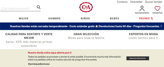La cadena de tiendas de moda C&A informó ayer que, durante este período de restricción de movimientos para luchar contra la expansión de la pandemia de coronavirus, los pedidos que se realicen en su tienda online serán entregados a domicilio gratuitamente en Europa. La supresión de los gastos de envío pretende apoyar a los clientes confinados en casa debido al Covid-19. Adicionalmente, ha modificado su política de devoluciones ampliando a 60 días el plazo.