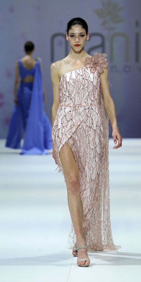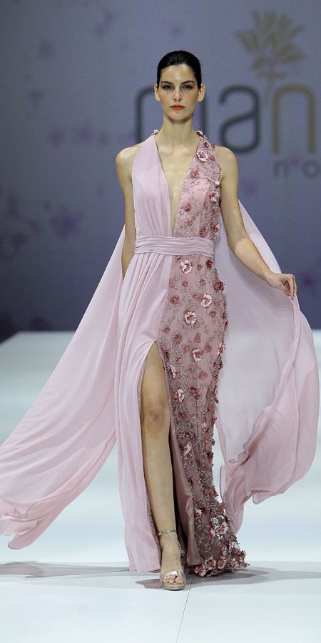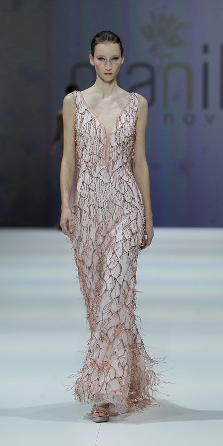 Gasas que dan movimiento, aberturas y plumas inspiradas en la naturaleza japonesa que ensalzan la feminidad, la ligereza, la frescura y la elegancia. (Descripción del autor/a y BBFW).