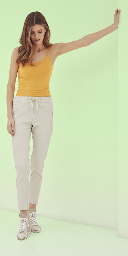 Los pantalones cargo y chinos en anchos informales cuentan con una suave mezcla de algodón y poliéster. El lino ya es ligero e informal de por sí. Las formas frescas reinterpretan la temática. El lino suelto Tencel [ojo. Tencel no es lino sino celulósica], forma parte del estilo jogging.