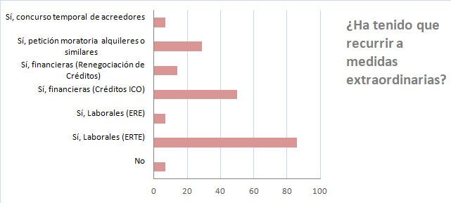 Solo un 7% no tuvo que recurrir a medidas extraordinarias. Pero en igual porcentaje tuvieron que acudir a concurso temporal de acreedores. Un 86% practicaron ERTEs y un 7% EREs. La mitad recurrieron a créditos blandos del ICO, un 29% solicitaron moratoria de alquileres y un 14% renegociaron créditos.