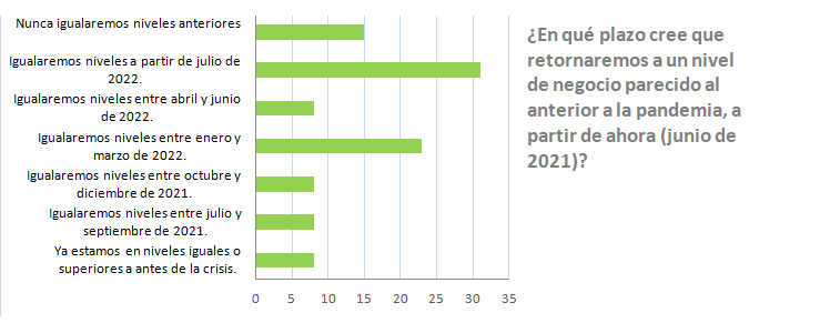 Un 8% ya estaba en el verano en niveles de negocio similares a los de la pre-pandemia. Pero un 23% no cree que los vaya a alcanzar hasta algún momento entre enero y junio del año próximo, y hay nada menos un 31% que opina que habrá que esperar a julio o más. Lo peor es que hay un 15% de pesimistas que opinan que nunca igualarán los niveles anteriores.