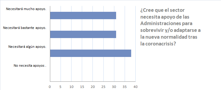 Todos los encuestados creen que el sector necesita apoyo de las Administraciones para sobrevivir y/o adaptarse. Un 31% cree que necesita mucho apoyo.